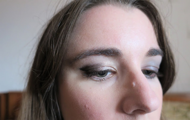 Esta maquilhagem é uma espécie de smokey eye, mas muito simples de se fazer. Comecei por aplicar uma sombra cinza com brilhos prateados em toda a pálpebra móvel.
